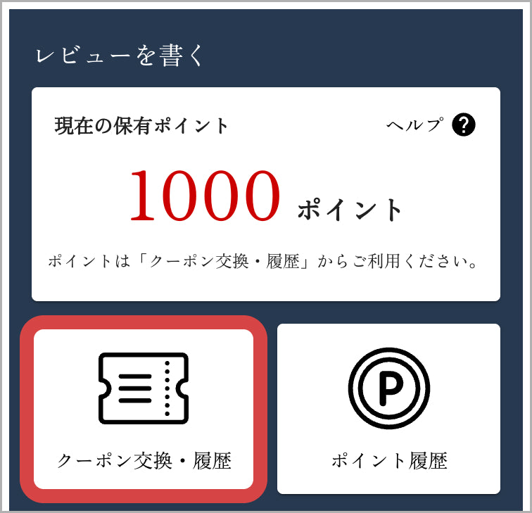1ポイント以上ポイントをお持ちのお客様は「クーポン交換・履歴」ボタンを選択していただき、クーポンの交換へ進みます。