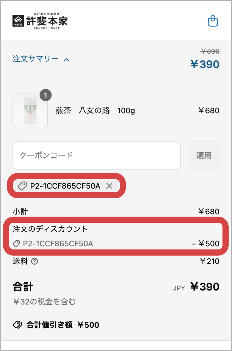 その後、お買い物をお楽しみいただき、ディスカウントとしてクーポンが適用されていることが確認できれば、購入へお進みください。