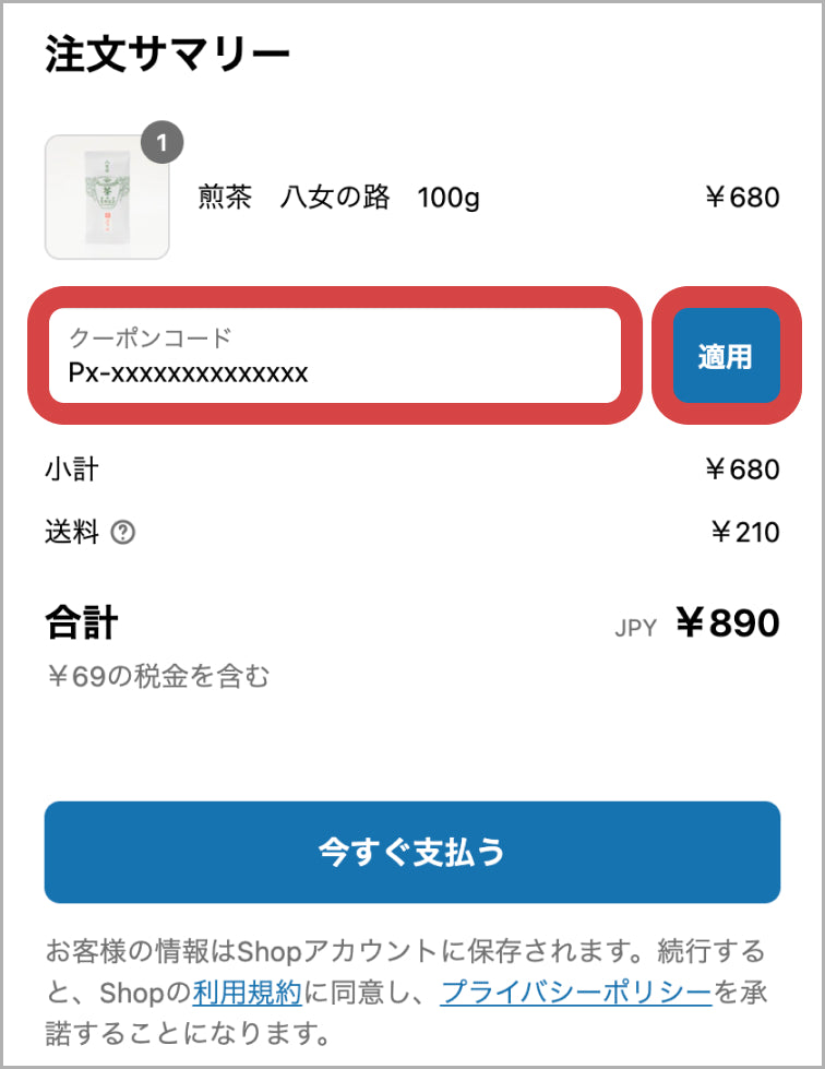 カート内か購入画面の「注文サマリー」と「今すぐ支払う」ボタンの上部にクーポンの適用箇所がございます。
